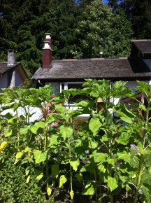 You can see why I am glad to have a wall of sunflowers growing right out front, to distract passers-by from these horticultural disasters. Along with the LynnValleyLife seeds we handed out, I threw in some Russian Giant sunflowers, but it's hard to tell at this point who is who. They have required very little TLC, and are loving this amazing sunny weather.