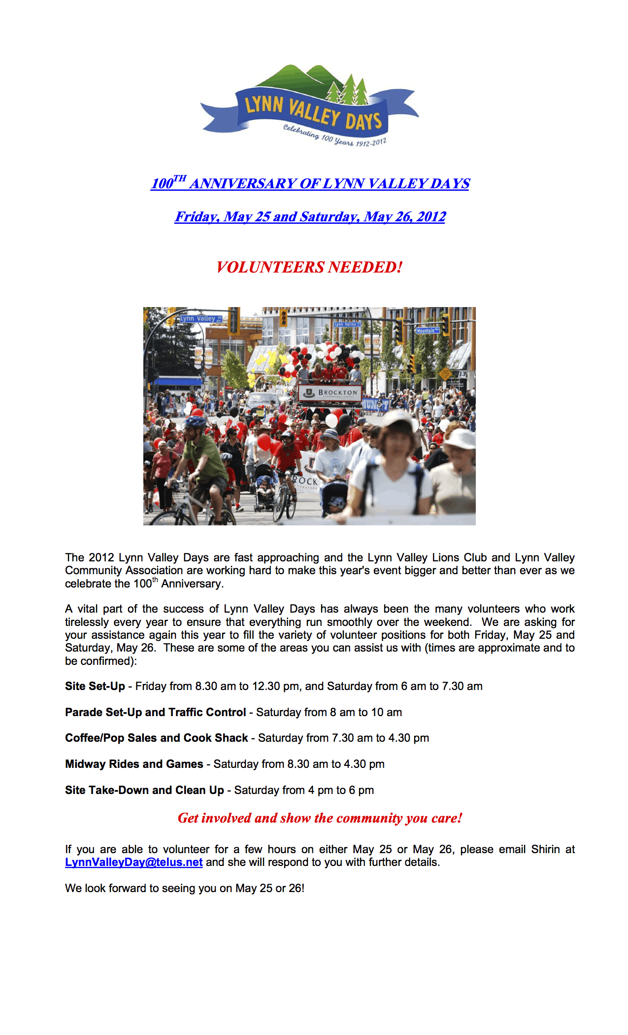 We know you've been meaning to give Shirin a call and just haven't gotten around to it.... so now's your chance! Shirin is the busy soul in charge of matching volunteers to various Lynn Valley Day tasks. Events are often a lot funner (yes, we've decided that's a word) when you're actively involved, and, as an added bonus, new legislation has ruled that any mini doughnuts consumed by volunteers contain no calories. So what are you waiting for? Please see the poster below for specific volunteer requests, and help Shirin fill those last slots!