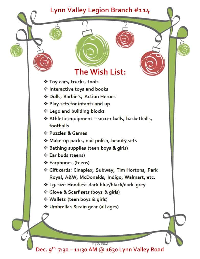 Lynn Valley Village will come alive with the lights of dozens of Christmas trees, with a special "Lynn Valley Christmas" light-up ceremony happening on Sunday, December 6 at 4:30 p.m. You can look forward to crafts, carols, face painting and balloons and a visit from a very special guest! This great community forest of twinkling trees is sponsored by the LV Community Association, the LV Lions (who provide the trees), the LV Legion and NV District. Attendees to the light-up event are encouraged to bring a gift for the LV Legion's Toy Drive (speaking of which, read on….)Legion hosts 'drive n' drop' gift drive!