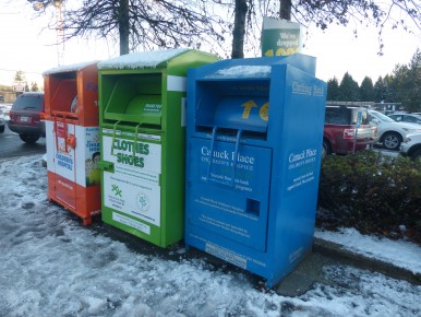 The blue box on the end of the row is a fundraiser for Canuck Place Hospice. A disclaimer on the box states that the service is owned and operated by Trans-Continental Textile Recycling Limited, which donates a portion of proceeds to the hospice. If you have any questions, you can phone the company at 604-592-3008. A letter on the Canuck Place website attests to the fact that over $300,000 has been donated to the charity through this method