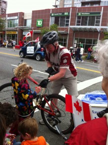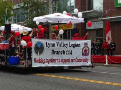 If you've come here looking for excellent photos of the Canada Day Parade, you've come to the wrong spot.If that's what you're after, you're advised to keep an eye out for the fine work of my former colleagues at the North Shore News. I, on the other hand, love parades but spend too much time misty-eyed and waving flags to be able to produce much in the way of a visual record.Between the stirring salutes exchanged between the marching legionnaires and the uniformed members of the reviewing stand, the skirl of the pipes, the dashing Mounties in red serge, the old folks in their red-and-white bedecked electric scooters and the young 'uns standing tall to sing O Canada, there is much to touch the sentimental heart. A parade celebrates all that is good in a community: the volunteers and creative souls; the rescue heroes and the service men and women; the non-profit organizations that help people around the block and around the world.So I had much to occupy my hands this morning, given the need to alternate eye-dabbing with candy-catching, and frankly you are darned lucky to get any photos at all out of me.But I did realize it was my duty to pull myself together long enough to snap a few shots of some of our neighbourhood entries, so here they are, along with my very best LynnValleyLife wishes for a happy Canada Day.- Peggy Trendell-Jensen, Editor