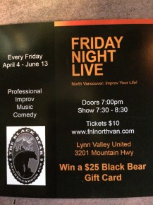 Another highlight to look forward to in April is a new partnership with the Black Bear Neighbourhood Pub. Starting April 4, each week one FNL audience member will win a $25 gift certificate - so who knows, you might come for the entertainment and walk out with post-show pub fare as well!Friday Night Live opens its doors at 7 p.m. at Lynn Valley United Church, with the show beginning at 7:30 p.m. Complimentary refreshments come along with your $10 ticket (kids 12 and under are free, family max is $25). For more info, visit www.fnlnorthvan.com, or find them on twitter @fnlnorthvan, or on their Facebook page.