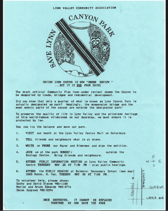 “I wasn’t a tree hugger – when I saved the canyon everyone put that title on me but I just loved it – loved the beauty of it. I felt that it was something that should be kept sacred and enjoyed by all people,” said Bragg. “It’s a magic spot. The beauty of the water rushing after the rain, the sun coming through and shining on the moss and the ferns.” One day a simple postal delivery changed everything.“I hiked the canyon every morning before going to work,” said Bragg. “Then one day in the mail I received a colourful brochure from the district saying there would be 2000 houses built in the park including a highway going through the top of LV road going through to Hyannis. “I was appalled because it was at the third reading and I had never heard of it. Us locals always called it Lynn Canyon Park and the references to development were calling it Inter River. At that time Seymour wasn’t developed and we thought it was kind of out there.”This put Bragg in a difficult position. As a realtor and director of the Real Estate Board, she was well aware she was about to fight against 2000 home sales. “I had never been involved in anything life,” said Bragg. “My husband thought I had gone stark steering mad because I was the type of person to sit in the back of a room so no one would ask me any questions and I would never put my hand up.”Bragg was quick to leverage the community. Hand delivering hundreds of flyers sharing a news article and compelling residents to show up at the third reading of the development permit. “And to my surprise when I got to the district hall for the meeting there were crowds there. It was so big that the mayor moved it over to the school gymnasium down the street. Over a thousand people turned up. “We had no computer, no cell phone, no fax in those days. It had to be done by gumption, as they say, and word-of-mouth.” As Bragg distributed flyers she connected with another passionate family and together they spread the word. “At a public meeting, everyone has to be able to speak and over 300 signed up stopping the vote from being taken.”That pause in the process led a small group of advocates to form the Save Lynn Canyon Association and fight a two-year battle. “We used to stand in the park and sell memberships – a lifetime membership was about $1. We raised funds to get the word out and managed to put out four newsletters regarding saving the canyon,” said Bragg.“We eventually made it a political thing and two and half years later we pushed it to a referendum,” she said. “Then we crossed our fingers that people would turn out and pleaded with people to vote – whichever way they wanted. We were successful. Six thousand people voted to keep it a park and 500 against.”When the dust settled North Vancouver had the Lower Seymour Conservation Reserve and Lynn Canyon Park as we know them today. Bragg credits many others who joined her in the fight for Lynn Canyon Park for the campaign's success, including many passionate youth from Argyle. “There is a cairn in Lynn Canyon Park that shows the district council at the time that officially formed the park – including all members who first voted against it,” said Bragg. “None of us who actually fought to save the park are mentioned – we weren’t exactly popular.”
