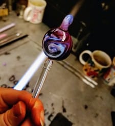 selfp“I wanted to tie into the existing natural gas line but the torches we use were not CSA approved – they never would be. Glass art is a small industry and the cost for the manufacturer would be insurmountable,” said Brian – but he kept pushing, motivated by the commitment of Argyle’s Parent Advisory Committee to help buy equipment. “I found these torches that were made in Canada and got them certified by the BC Safety Council – they are now certified for use in all B.C. schools.”This groundbreaking work has led to an additional school in North Vancouver starting its own program and another at a school in Vancouver. The program is so in demand, Brian has requested that their current space and tools be doubled to six for the Argyle replacement.“This is all-round learning,” he said. “The kids are self-motivated, they are following artists on YouTube and Instagram. They watch and learn at home and come in to try a new technique in class. They have far surpassed what I can do.”Glass art as a diverse learning opportunity is echoed by Kylie Graffi, a grade 10 student.“There is a lot of science in this – the minerals change at certain temperatures, you have to know how they will mix and change colour,” said Kylie. “This is art but it is also like my therapy. In the middle of a stressful school day I know I can come here and go to the glass to create.”Students learn stained glass, flame work and fusing. They turn rods of clear basilic glass with special coloured rods imported from Murano Italy – famous for its fine glass work.“Every time I tell people about it, I say how lucky I am to have been exposed to this at school. I literally found my passion. I am addicted,” laughs Kylie as she works on her pendant. “I sit in my other classes thinking about a technique I want to try or looking for inspiring colour combinations. It’s a unique medium to explore.”The passion has motivated Kylie to work on her art outside of school, taking part in summer classes at Terminal City Glass where she had to prove her skill and passion for them to make an age requirement exception.“I specialize in jewellery, beads, pendants bracelets,” she said. “I do wire work to combine with the glass to make rings.”As Kylie chats, she fuses colours onto a glowing glass pendant. Watching through her dark safety glasses she carefully swirls the colours creating a stunning vortex. She adds a thin stem and precisely turns it into a loop for the pendant – all the while impressively explaining her love of glass and how she creates it.Along with the torches, the glass corner has kilns to slowly cool the pieces to stabilize the molecules and prevent cracking. There are molds and tools hanging created by the students themselves in the school’s metal work shop.A peek in the kiln shows students have been hard at work making intricate pieces for holiday gifts.“I am working on Christmas presents for my friends,” said Kylie. “I thought it was more meaningful to show them through art how much they mean to me rather than just buy them some chocolates. I am making them pendants that are all similar but have different colours and designs that reflect their personality.”She has built up a bit of a following, hosting a small glass sale earlier this year where pieces ranged from $20-50. She is loving it so much she is exploring the possibility of opening her own online Etsy shop. You can check out more of her work on Instagram.“This will be my art but I think it will be a hobby. You know there is that saying about starving artists…,” she laughs adding she thinks she will always continue to learn and explore glass as a medium.As retirement looms, reflecting on the class he has built, Bryan adds:“They don’t need me anymore. They learn from each other. The kids are driving it and it’s amazing to watch.”