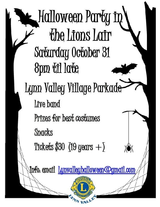 We've already told you about all the fun Halloween happenings for Lynn Valley's youngsters - but this neighbourhood is throwing a few bashes for grown-up ghouls and gals, too!New this year is a parkade party - yes, that's right - in the "Lions Lair," aka the parking lot underneath Lynn Valley Village that will be decked out as a haunted house for the family entertainment in the village in the afternoon.Come night-time on the 31st, though, it's adults only, with a live band, prizes for best costumes, snacks, and all the scary good time you can handle. This is a fundraiser for the Lynn Valley Lions, so put the kids to bed and come on down to show your support! The fun starts at 8 p.m. and goes 'til late. Tickets are $30; please email [email protected].