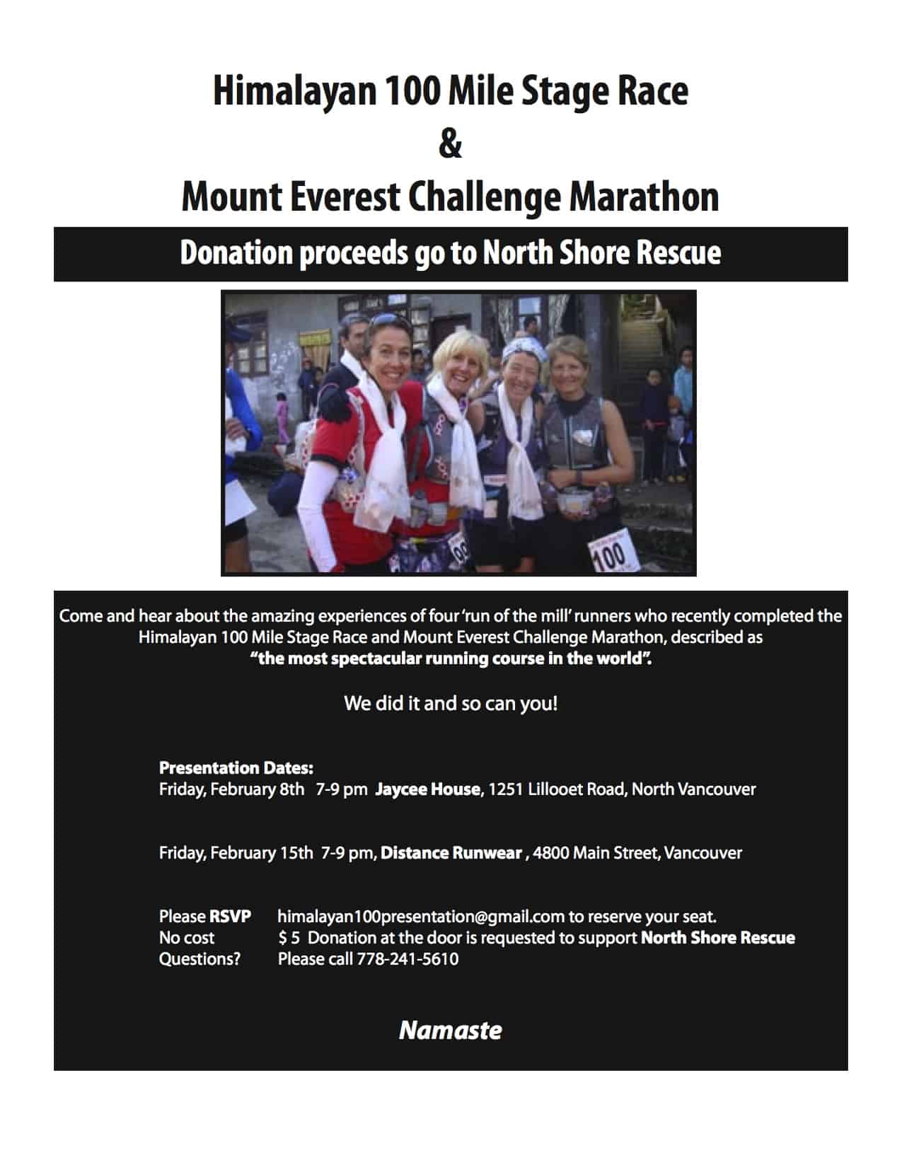 We recently reported that Lynn Valley's Hilary Ewart had successfully completed a 100-mile, five-day run through India's Himalayan range, in the company of other North Shore running friends.Now you can come hear Hilary and three other runners talk about their Himalayan adventure, along with the Mount Everest Challenge Marathon, at Jaycee House on Friday, February 8. See details below!