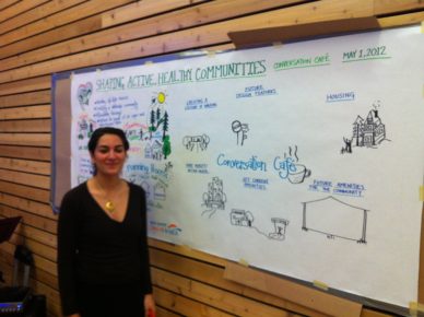 But the decisions being made now don't affect just them. They affect busy, double-income families and single seniors. They affect our lower-income residents and our mortgage-free homeowners. And they affect our children, most of whom will have to leave this community to search out affordable accommodation elsewhere - unless, of course, things change.At tonight's Conversation Cafe, hosted by Vancouver Coastal Health, the Heart and Stroke Foundation, and North Van District, North Shore Health Officer Dr. Brian O'Connor told us that as far as our health is concerned, district planners are far more important than doctors."The decisions they make shape the context of your everyday life," he said. "Your health doesn't depend on the advice of your physician; it depends on where you live."As just one example, he pointed to study that found a typical, 35-year-old male who lives in a walkable neighbourhood weighs 10 pounds less and has better physical and mental health than his 'twin' who lives in a lower-density, less-walkable community.It's also been discovered that children who live in higher-density, mixed-income neighbourhoods score better on 'school readiness' assessments than children who live in uniformly wealthy neighbourhoods, as they have easy access to a wider range of community services.Finally, seniors who are able to stay in their home community have more social connections and lower mortality rates than those who have to leave their familiar neighbourhood.Clearly, community planning affects every age group, income level, and interest group. Unfortunately, most of us are too weighed down with the busy-ness involved in the present to pay enough attention to the future.Which is why it's so great the District is doing all it can to make engagement easy, interesting, and - yes - even enjoyable! Take tonight as an example. Attendees were given a lovely, heart-healthy dinner and entertained by a live jazz combo; they heard interesting presentations, had the pleasure of having their views actively solicited, and even witnessed the evening unfold visually as artist Taraneh Erfan King used her felt pens and fine doodling to bring people's thoughts to life.So, please accept district planners' invitation to get involved. Help ensure that our neighbourhood can be a vibrant community that is home to people at all ages and stages of their life. Over the next 20 years, it is projected that 5,000 people may move into this community - this is not a small project!If you can't make an in-person event, be sure to make time to review and comment on the proposals online.A Cultural Plan Open House is taking place in the LV Village Community Room on Thursday, May 3, from 5 to 8 p.m. Details,
