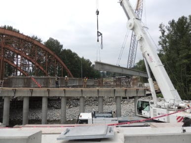 Cranes positioning girder for installationA new onramp from Mountain Hwy onto the highway heading westbound is also coming along nicely and will ease the pressure off the Lynn Valley Road onramp. Highway 1 will also be widened with the construction of additional lanes including the construction of two 2-lane bridges on either side of the existing 4-lane Lynn Creek Bridge.The Mountain Highway/Lynn Creek, Keith Road/Seymour Parkway and Main Street/Dollarton Highway Interchanges will be upgraded in four phases. Improvements will address safety, queuing and delays and will help to improve travel times along Highway 1 and the Lower Lynn Interchanges.