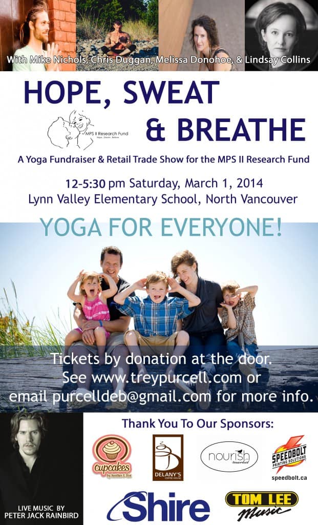 Hope, sweat and breathe. When times are tough, sometimes that's all you can do. And when times are good? "Hope, sweat, breathe" can be the best plan of action then, too.Lynn Valley's Ryan and Deb Purcell have experienced both good times and bad over the past few years, since their eldest son Trey was diagnosed with MPS II Hunter Syndrome just as he was turning two years old. Deb describes that doctor's appointment as a moment their "world came crashing down." They learned that Trey's rare disease - or "difference," as they like to call it now - would likely curl his hands, compromise his bones and organ function, and shorten his life. (You can learn more about Trey's story here.)But along with the valleys have come many peaks - most noticeably, Trey's acceptance into a North Carolina-based drug trial that has helped him immensely. Trey travels to North Carolina on a monthly basis in order to receive an IV enzyme infusion into the intrathecal space in his spine, which allows the critical replacement enzyme to cross the blood-brain barrier and get where it is needed.Ryan and Deb know other families who have not been so fortunate. They help other parents advocate for similar therapy - while the enzyme is approved for use in Canada, not all provinces will fund its use - and they raise money to fund research into a cure for Hunter Syndrome.Hope, Sweat and Breathe takes place on Saturday, March 1 - Trey's 10th birthday, a milestone they didn't always expect to celebrate. It will take place at Lynn Valley Elementary and feature a variety of yoga classes with different teachers. Doors open at noon, and 45-minute classes, suitable for everyone, will be held every hour from 12:30 through to 4:30 p.m. Attendance is by donation, and participants are asked to bring their own mat - and to stay for birthday cupcakes at 4:30! Other features will be a healthy-living trade show and a diamond necklace raffle.Deb says it was important to her to host the event within Lynn Valley: "I believe community is so, so important. Life and parenting can be hard and I want us to be able to ask each other for help - watching kids, borrowing eggs if you run out while baking, lending tools and helping each other hang Christmas lights, that sort of thing."And as far as her son goes, she says "I want our community to know him. Especially when you have a child who has a lot of differences, it helps when people know who he is and what he's about. That he may have hearing aids and may act silly or not talk the same as other kids his age, but that he LOVES life …..That all he wants is to be liked and included, just like the rest of us. I want us as a community to know and support our neighbours."As you can see by her unflagging support and advocacy for other families grappling with Hunter Syndrome, Deb is all about community. And while the number of children with Hunter Syndrome may be a relatively small group, their circle is wide - at the moment, Deb is actively advocating for a boy in Chicago whose condition will likely be terminal if funding for treatment is not approved.Closer to home, Deb appreciates every bit of support they receive for the cause: "When Trey was diagnosed, Ryan and I were told Trey might not be alive at the age of 10. Everyone who supports our event in any way, shape or form, in my heart and mind, is joining our family…. No matter what the level of support, every bit has HUGE meaning in my heart."For more information about the event, Hunter Syndrome, or Trey himself, visit www.treypurcell.com.