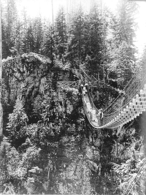 You buy lemonade for eight cents from the refreshment stand and sit down to enjoy a relaxing lunch in the picnic area under the shade of a few smaller trees. You hear the water rushing through the canyon and feel the breeze as it blows through alders that line the creek. You reach into your pocket, looking for 10 cents that will allow you to cross the suspension bridge, a swinging bridge that stands a daunting fifty meters above the rushing Lynn Creek.This was Lynn Canyon Park when it opened on September 12, 1912. When Mr. J.P. Crawford originally proposed a park to the McTavish brothers who had logged the area, all parties involved had great real estate dreams of drawing people to Lynn Valley. Although logging was the main industry in the area, Lynn Valley was still fairly heavily treed and would be a beautiful, sought-after area in which to live. To create the core of the park, the McTavish brothers made a 12-acre donation which was met with a 10-acre donation from the District Council of North Vancouver.Their business venture was a huge success, and for seven years the park was a thriving tourist destination. However, just seven short years after the park opened, it changed dramatically. Following three weeks of straight rain, on November 14, 1919, several acres of land collapsed into the river, bringing with it most of the park infrastructure: the caretaker’s cottage, the bandstand, the refreshment booth, and the picnic tables.Over time, the park has been rebuilt and transformed again and again by nature and by people. Since 1971, the Lynn Canyon Ecology Centre has provided education for over 2.6 million visitors to the park. The Centre was built in the shape of the Dogwood blossom, B.C’s floral emblem. The Centre provides park visitors with an opportunity to learn even more about this ever-changing wilderness that sits just next door to Vancouver.Over the last 100 years, the once-tiny firs, cedars, and hemlocks left behind by long ago loggers have grown into huge trees that inspire millions of visitors from around the world. The suspension bridge draws line-ups of visitors every summer, and it’s cheaper than it used to be: it’s free! Today, Lynn Canyon Park conserves 617 acres of temperate rainforest, providing a wilderness oasis on the urban fringe and catering to families, tourists and outdoor enthusiasts alike.