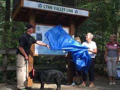 The hard work of Lynn Valley Community Association volunteers and district parks staff - and the leadership of local residents Suzanne and Gabriel Mazoret - was celebrated at Lynn Canyon on September 16 with the grand opening of the Lynn Valley LINK trail.The trail links previously existing trail networks such as the Baden-Powell, Princess Park, Lynn Canyon, Inter-River and Kirkstone Park paths to create a pedestrian route that circumnavigates Lynn Valley. New Lynn Valley LINK information kiosks are up and running at the five trailheads that offer parking facilities - Lynn Canyon Park, Inter River Park, Kirkstone Park, Princess Park, and the Fromme Mountain lot at the top of Mountain Highway. Along with the LINK map, each kiosk features historical information and photos specific to the immediate area.At the Saturday event, LVCA president Gillian Konst thanked all those involved, and encouraged people to join the LVCA to play a role in community projects and initiatives such as the LINK trail. She noted that the next stage of the LINK will include creating pedestrian "spokes" from the perimeter LINK trail into the hub of Lynn Valley.The Lynn Canyon Park kiosk was then unveiled with a flourish by DNV Mayor Richard Walton and Suzanne Mazoret. Those in attendance, including other council and provincial representatives as well as LVCA members and citizens, then retired to the park's picnic area where a number of displays were set up by groups such as the District Parks Adopt-a-Street program and the Friends of the North Vancouver Museum and Archives. An excellent cake donated by The Butler Did It catering company was much enjoyed, especially by NVD councillor Mathew Bond who arrived on bicycle and was ready for refuelling after a good ride.For more information about the LINK project and the Lynn Valley Community Association, visit the LVCA website.