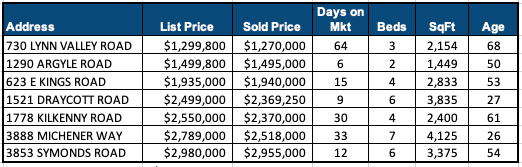 There were 7 detached homes sold in October with an average sale price of $2,131,035 (median = $2,369,250)