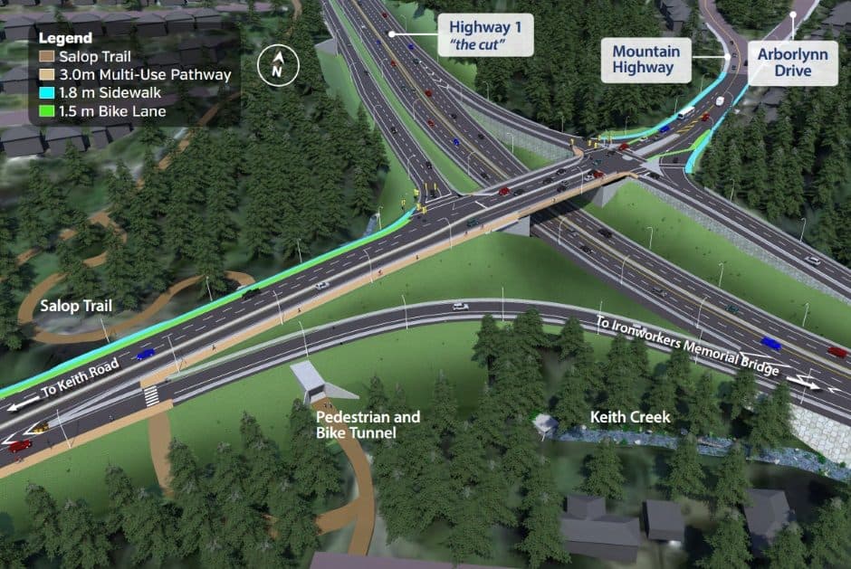 Construction will begin here in the summer of 2017. There will be a new overpass connecting Keith Road and Mt Seymour Parkway, plus a tie in to the new Keith Road widening project currently in progress, better cycling and pedestrian routes and better bus access and stops. This part of the project will be completed by March 2020. Click