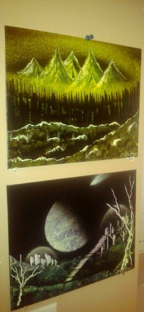 Then about five months ago I was flipping through YouTube videos of graffiti artists when I saw this other style of painting using spray paint. People were creating planets and detailed landscapes using paint, magazines for texture, lids off of jars that act as a stencil for the planets, sponges, pallet knife. Mainly everything you can find in your own home.This style really intrigued me, so I went down to Opus and picked up some spray paint. The first one I tried was a simple space scene. It came out so cool. From that first canvas I was hooked. From there I have progressed from simple space scenes to advanced nature scenes, with mountain ranges, waterfalls, trees, bushes. The spray paint changed my style from very cartoony landscapes and characters to more detailed, true landscape pieces.I’m an aspiring artist who works landscaping during the day and paints it by night.