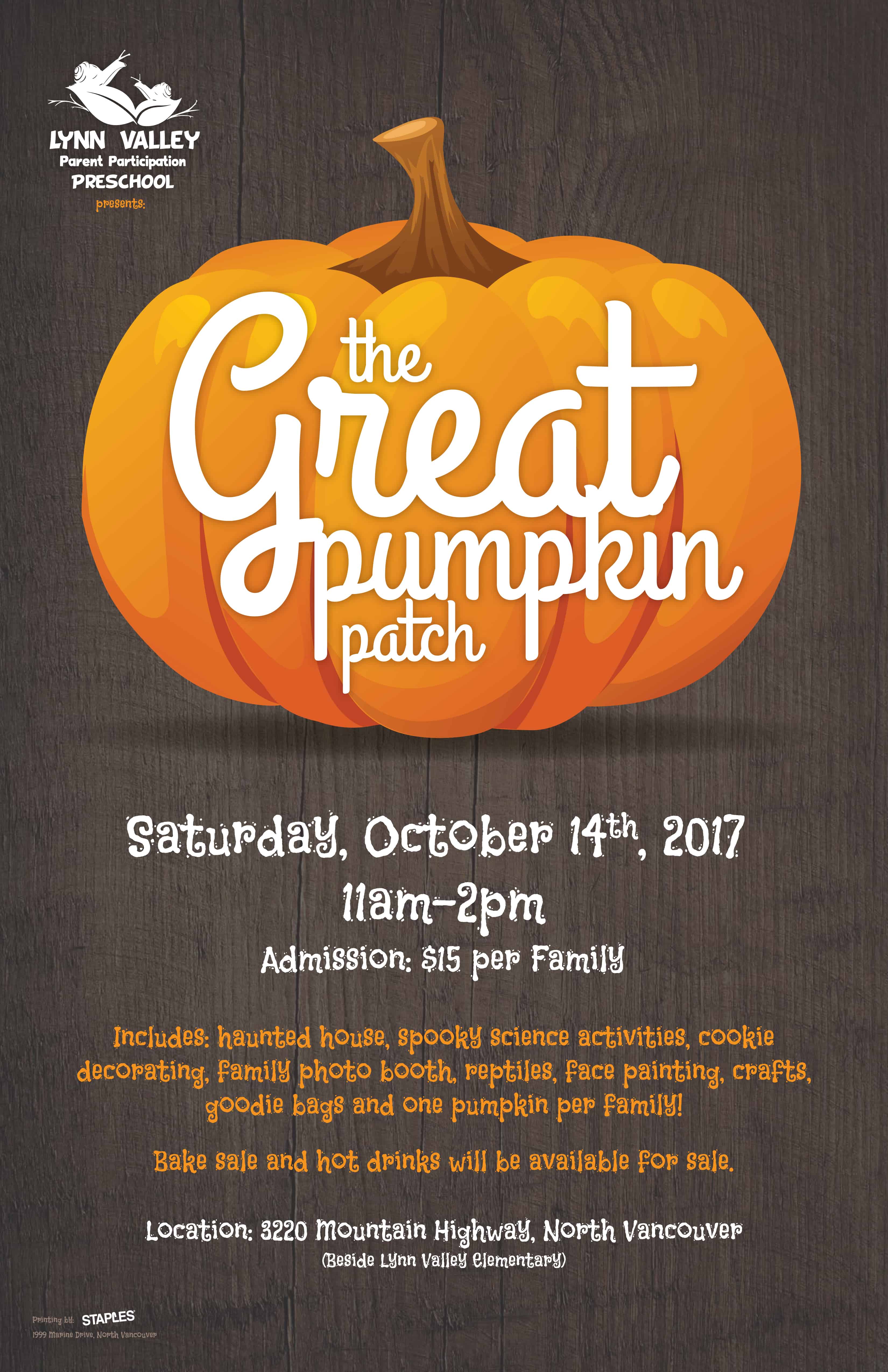 It's almost that time of year for the Great Pumpkin to descend once again (whether Linus sees him or not!) to transform a Lynn Valley field into a magical pumpkin patch.On October 14th starting at 11am, there will be Halloweeny fun for all ages, hosted by the Lynn Valley Parent Participation Preschool and Lynn Valley Elementary.See below for more details.We are proud to once again be sponsoring these two family-friendly events!
