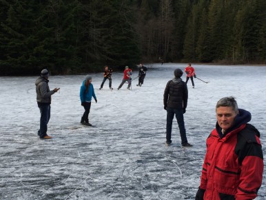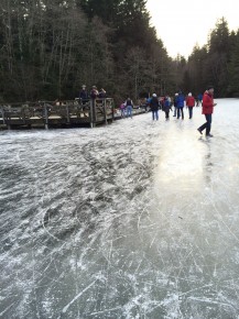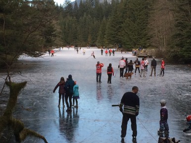 Even those of us who have lived in Lynn Valley most of our lives don't have many "back in the good ol' days" stories about skating on local waterholes. The small 'swamp' off of McNair Drive in Mountain View Park would very occasionally freeze over enough to provide a destination for a few skaters, but there wasn't room for many, and 'skating' was probably an over-generous verb to use to describe the experience of shakily navigating between the branches and logs frozen into the muddy ice.Rice Lake in those years was still an off-limits watershed, accessible only to those brave/foolish/hardy enough to cross the river via the pipeline you can see to the north of the current pedestrian bridge.