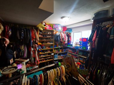 “Talking with friends we realized the amount of money we were spending in thrift shops after we donated to them. The idea of a clothing swap led to this,” she said gesturing to the lower level of her home filled with stock from the
