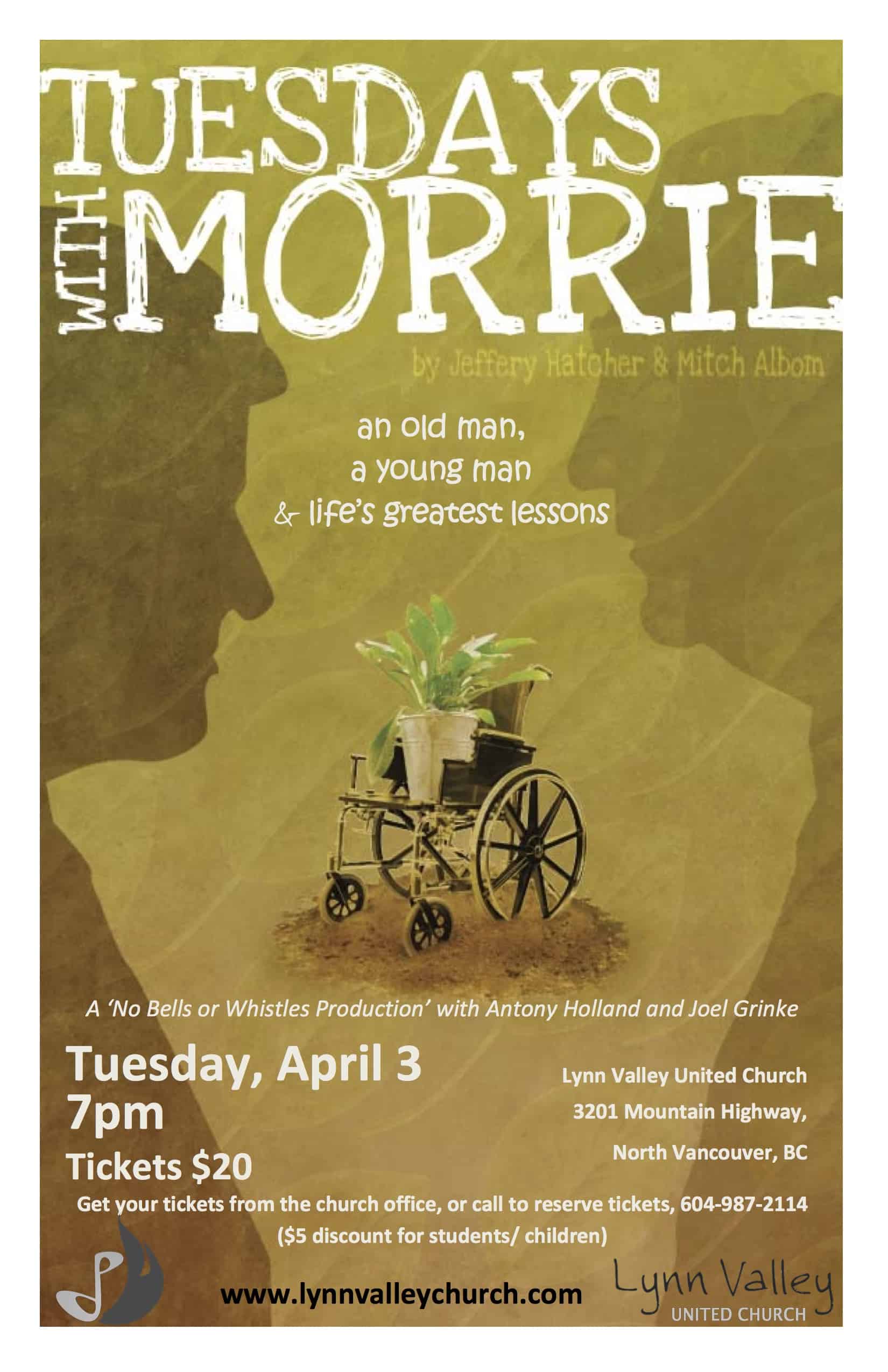 Lynn Valley United Church is thrilled to announce a special one-night performance of the critically acclaimed play by Mitch Albom and Jeffrey Hatcher, “Tuesdays with Morrie,” on Tuesday, April 3, at 7 p.m.Featuring the multi award-winning actor Antony Holland and local rising talent Joel Grinke, this story speaks of connection, loss and renewal, and is offered as part of the church's “real stories of Easter” Holy Week experience.Tickets are $20 ($5 discount for students), and are available at the church office or at the door on the night of the performance. Proceeds from the performance will go towards repaying the government resettlement fees of the refugee family the church has been helping to support over the past 11 months.Tuesdays with Morrie is based on the true story about the relationship between a sociology professor, Morrie Schwartz (played by Antony Holland), and his student, Mitch Albom (played by Joel Grinke). The two bond through mentorship, with Mitch graduating and promising to keep in touch…a promise he forgets almost immediately.Mitch abandons his creative passions and chooses a fast-paced career as a sports columnist that makes him extremely successful, but also a workoholic. Morrie, on the other hand, has since been diagnosed with ALS (also known as Lou Gehrig’s Disease) and forced to retire. News of Morrie reaches busy Mitch, who hops on a plane in hopes of clearing his conscience.With that one visit, and Morrie’s playful manipulation, sixteen years are erased and Mitch finds himself, once again, Morrie’s student; only this time, the lessons are far more important.For information or to reserve tickets, call the church at 604-987-2114; their website is www.lynnvalleychurch.com.